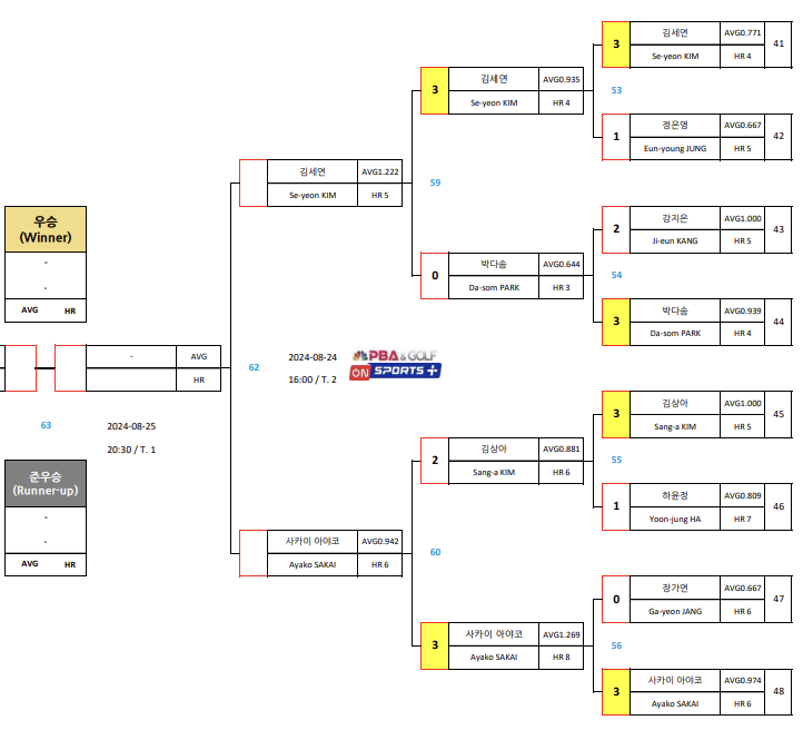 에스와이 바자르 하노이 오픈 LPBA 챔피언십 4강 대진표(2)는 사카이 아야코 vs 김세연입니다. 챔피언 vs 챔피언의 대결입니다. lpba투어에서 2회 우승한 사카이 아야코가 4회 우승한 김세연에게 도전합니다.