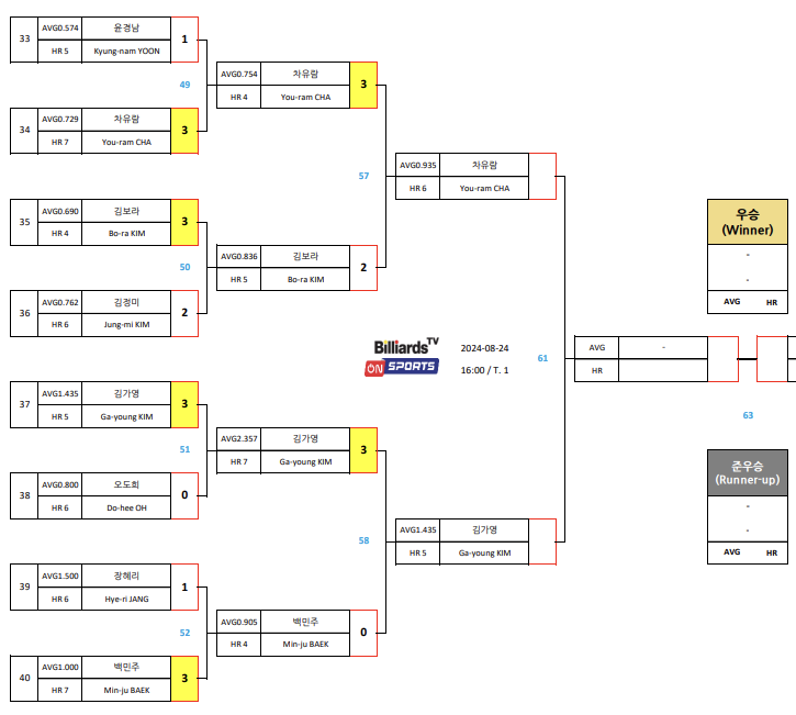| 에스와이 바자르 하노이 오픈 LPBA 챔피언십 8강 대진표 16강 경기결과 (0) | 2024.08.23 |