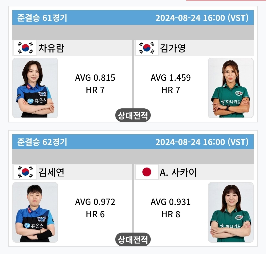 김가영- 차유람, 사카이 아야코 - 김세연 준결승전의 객관적 전력은 이미 LPBA 챔피언십 우승횟수에서 더 많은 김가영과 김세연이 앞서 있습니다. 하지만 경기결과는 뚜껑을 열어봐야 알 것입니다.