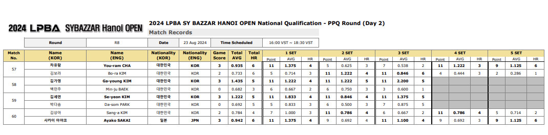 1. 에스와이 바자르 하노이 오픈 lpba 8강 경기결과