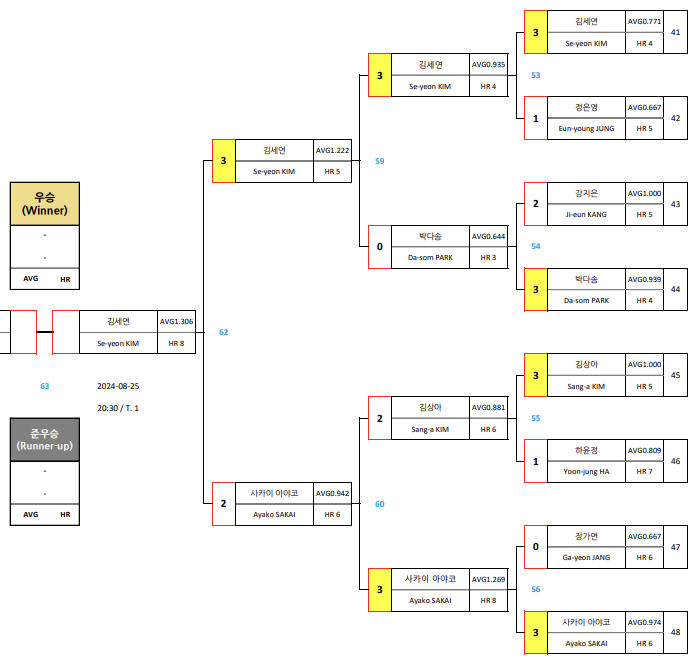 차유람은 애버1.429의 높은 경기력을 보였지만 훨씬 뛰어난 경기력을 보인 김가영을 넘기에는 한계가 있었습니다. 사카이 아야코 선수도 에버 0.972를 기록하며 첫 세트를 먼저 따내었지만, 김세연 챔프를 넘지는 못했습니다.