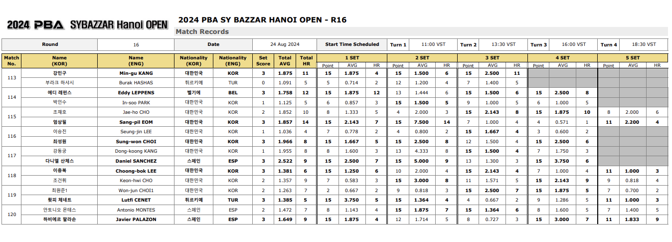 1. 에스와이 바자르 하노이 오픈 PBA 챔피언십 16강 경기결과