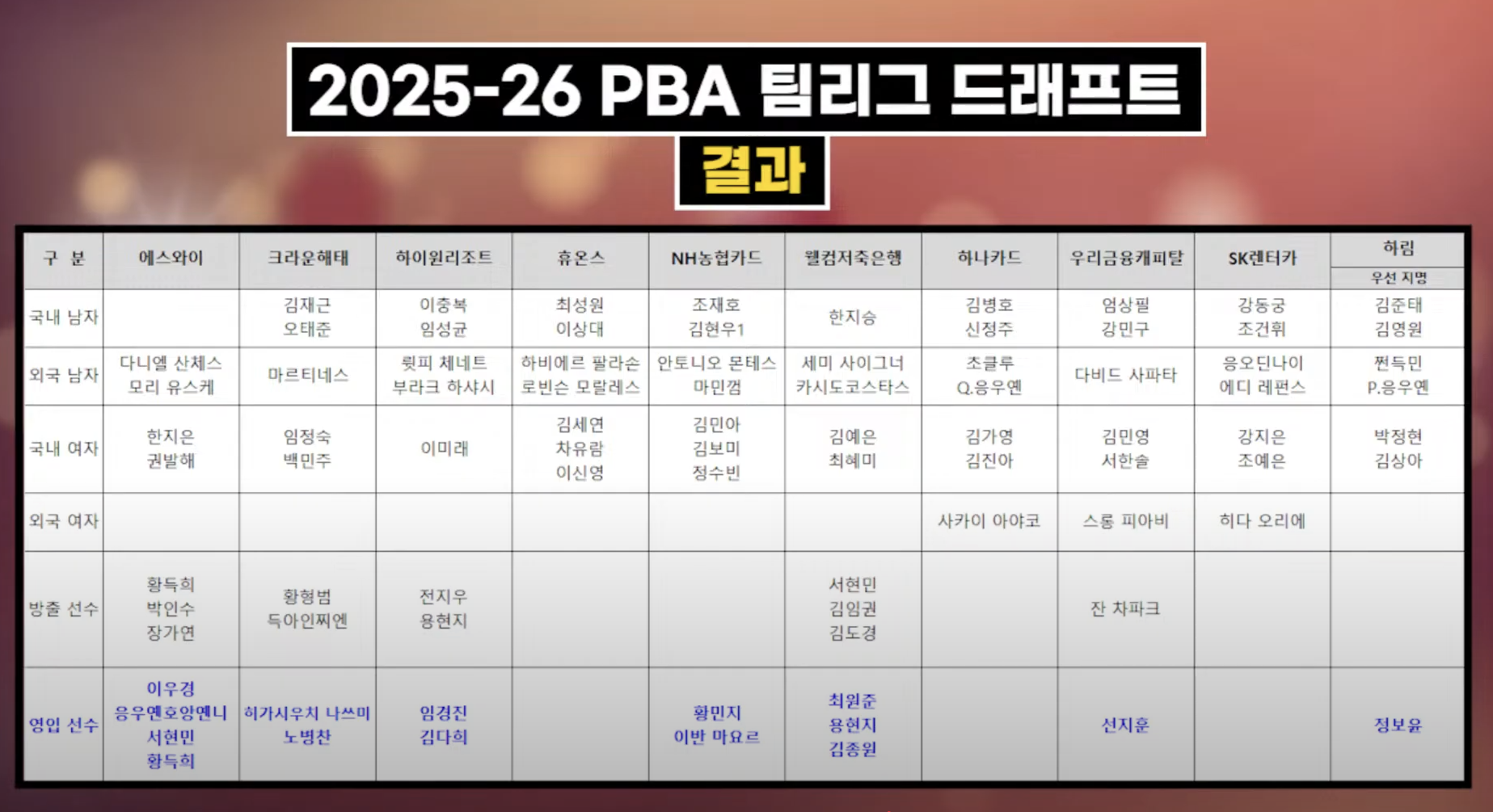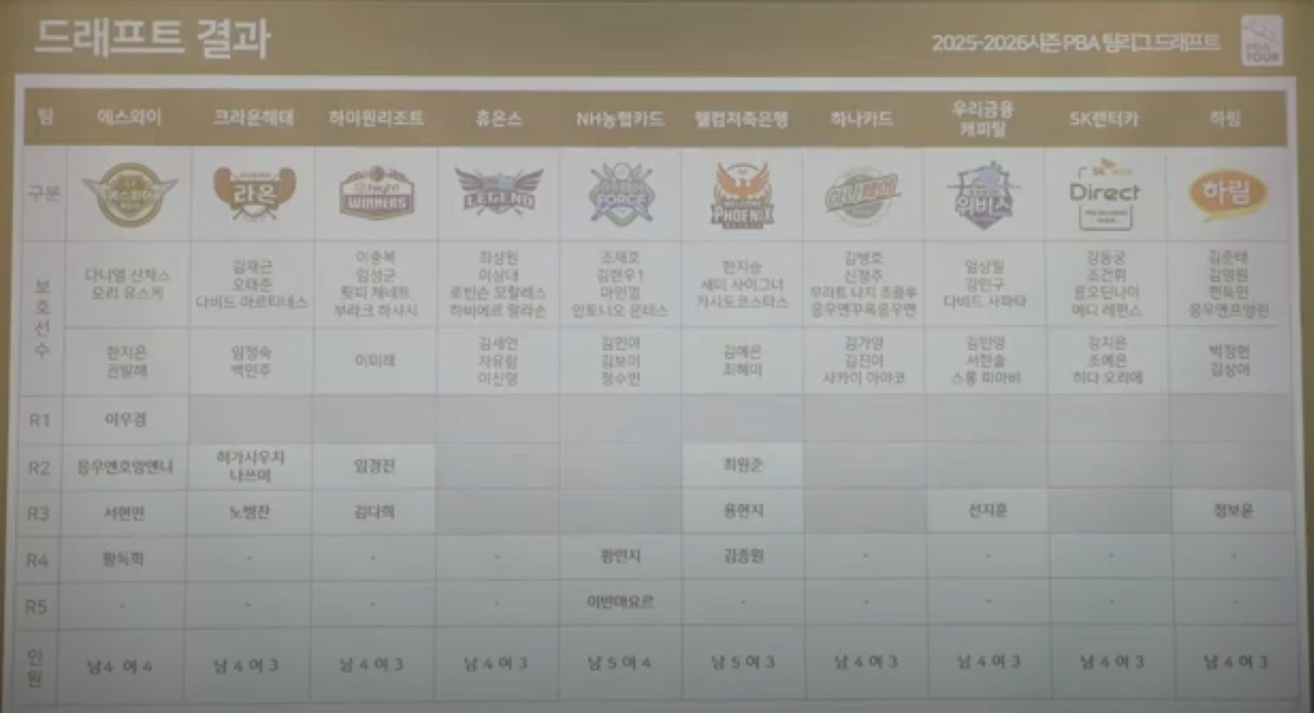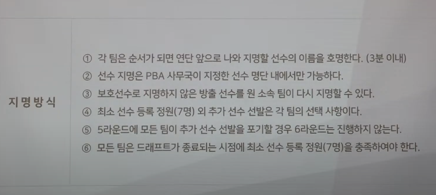 그럼 지금부터 각 프로당구단에서는 PBA 프로당구협회가 사전에 공지한 룰에 따라서 5라운드에 걸쳐서 선수 선발 지명을 하였으며, 그 결과는 다음과 같습니다.
