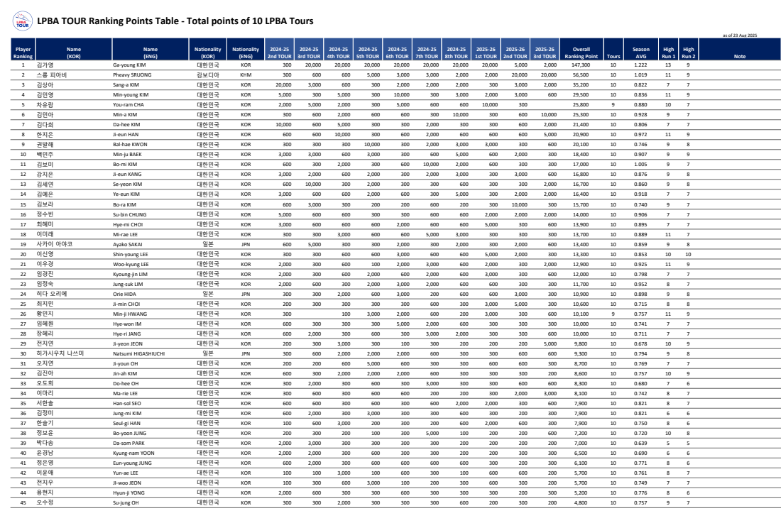 PPQ 라운드 대진표 할당기준 - 최근 10개대회 LPBA 선수 순위표